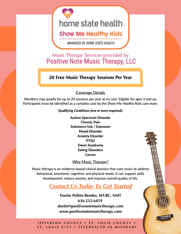 Currently, music therapy is only a covered service for foster and adopted children through Medicaid’s Show Me Healthy Kids program. We are thrilled to support our community with this initiative, which was just approved in 2024!
